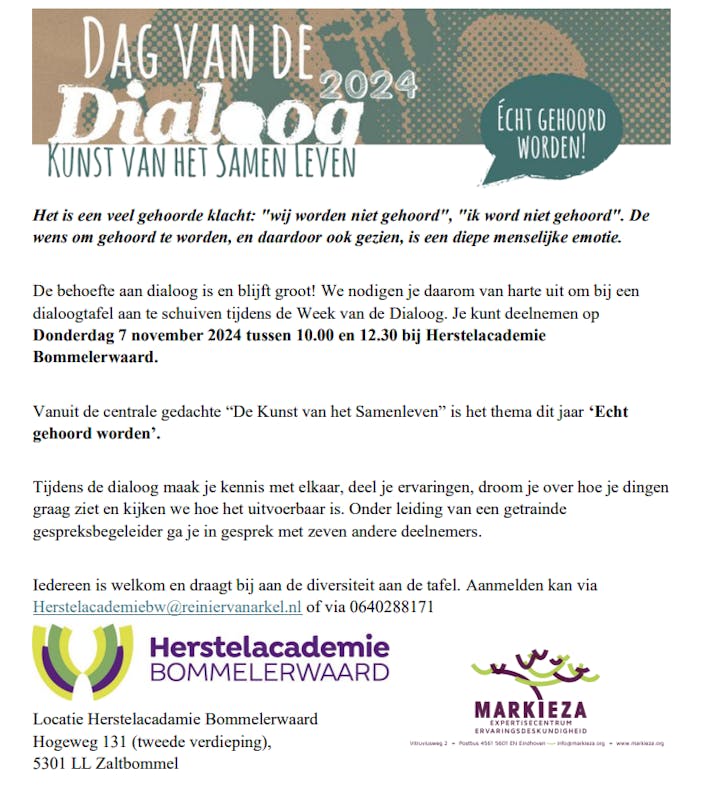 De behoefte aan dialoog is en blijft groot! We nodigen je daarom van harte uit om bij een dialoogtafel aan te schuiven tijdens de Week van de Dialoog. Je kunt deelnemen op Donderdag 7 november 2024 tussen 10.00 en 12.30 bij Herstelacademie Bommelerwaard.