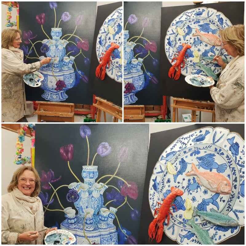 Door haar kleurgebruik en gekkigheden verrast tandarts Anneke Gostelie de kijker. Je denkt dat je een driedimensionale vis ziet zwemmen in een theekopje, in werkelijkheid zijn het drie geschilderde visjes die met lagen epoxyhars een beeld geven als of het een echte vis is. Borden met kreeft erop, beschilderd met olieverf en schilderijen met veel blauw/wit porselein( Chinees, Delfts blauw) met glinsterende vis, maar ook tulpenvazen met tulpen. Het meeste werk is geschilderd met olieverf en door veel lagen over elkaar te schilderen krijg je een diepte in het werk.