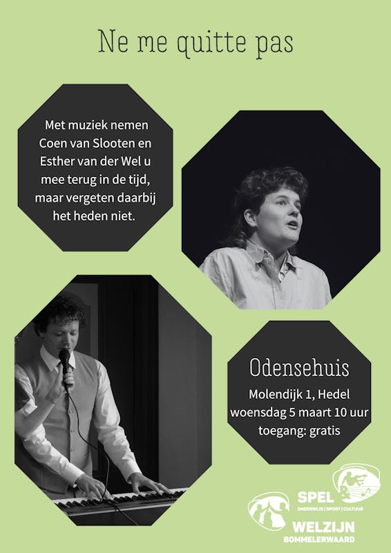 Een onvergetelijke muzikale ochtend wacht op u in het Odensehuis Hedel. Op woensdag 5 maart 2025 nemen Coen van Slooten en Esther van der Wel met muziek u mee terug in de tijd, maar vergeten daarbij het heden niet. Geniet, herinner en herleef.