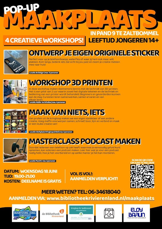 Ontwerp je eigen sticker, maak een podcast, creëer een nieuw object van oude spullen uit de kringloopwinkel of leer de geheimen van de 3D printer. Je bent 18 juni van harte welkom bij een van de vier workshops tijdens de Pop-up Maakplaats in Pand 9!