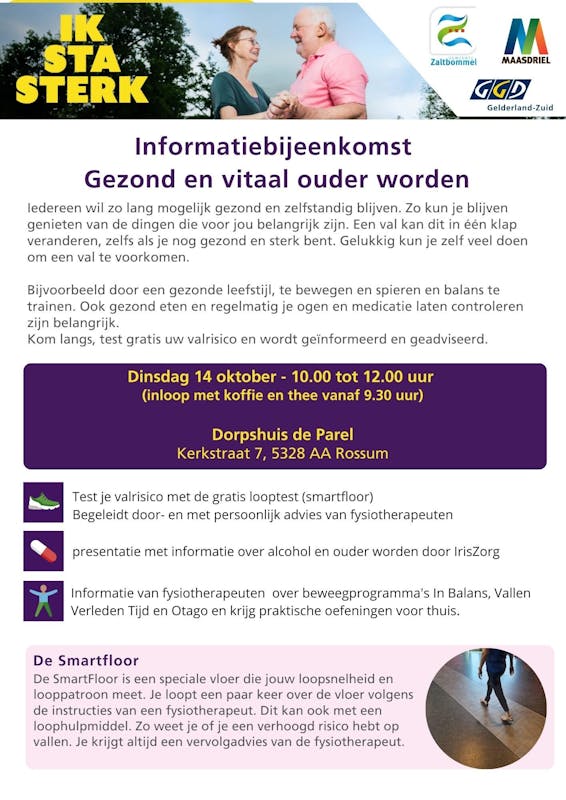 Iedereen wil zo lang mogelijk gezond en zelfstandig blijven. Zo kun je blijven genieten van de dingen die voor jou belangrijk zijn. Een val kan dit in één klap veranderen, zelfs als je nog gezond en sterk bent. Gelukkig kun je zelf veel doen om een val te voorkomen.