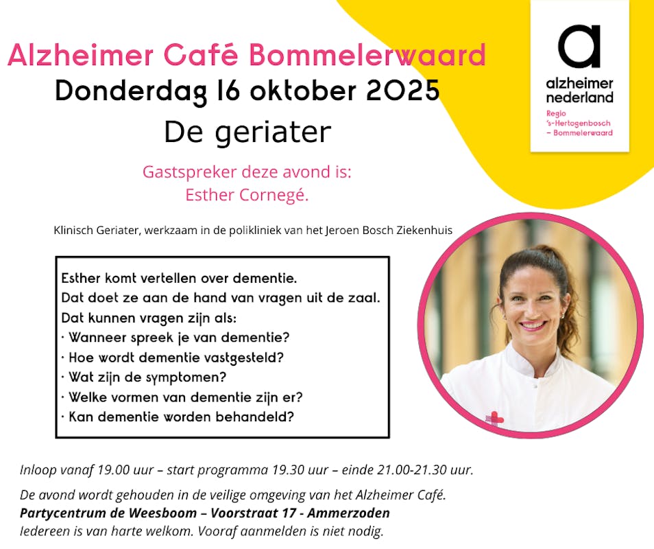 Het Alzheimer Café is een maandelijkse bijeenkomst voor iedereen met een vorm van dementie en hun naasten. Met deskundige sprekers, betekenisvolle onderwerpen en informatie over (omgaan met) dementie. Je bent welkom om te luisteren, vragen te stellen en ervaringen uit te wisselen.