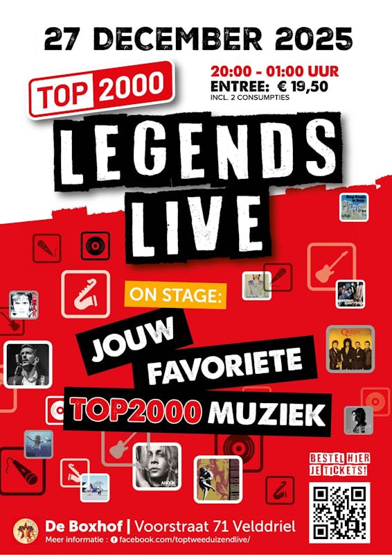 Het is ieder jaar weer een periode waar muziekfans met spanning naar uit kijken: de start van de Top 2000, waarbij de 2000 populairste platen achter elkaar worden gedraaid. Een bonte stoet van muziekstijlen en genres komt voorbij tijdens de laatste dagen van het jaar. Deze bonte stoet maak je zaterdagavond 27 december live mee tijdens TOP 2000 Legends Live in de Boxhof in Velddriel.