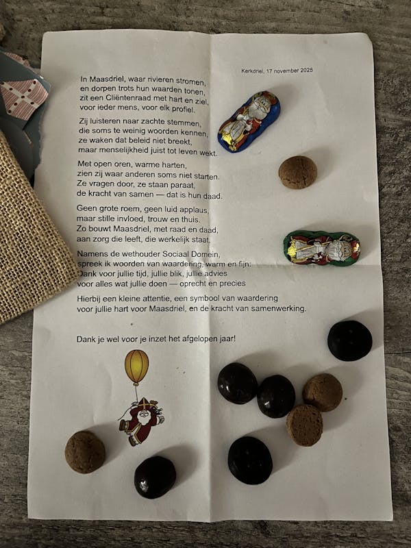 Tijdens de vergadering van vandaag werden we aangenaam verrast door een attent gebaar van de gemeente. Een onverwacht cadeautje met lekkernijen en een leuk gedicht zorgde voor een warme afsluiter van de vergadering.