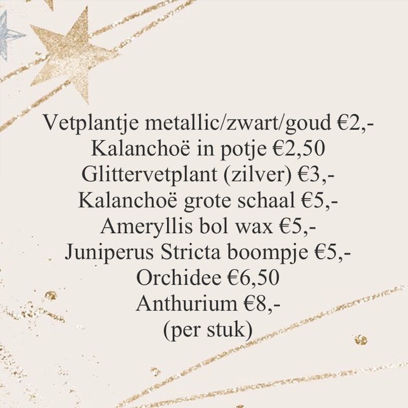 De verkoop bestaat uit een kleurrijke selectie: metallic vetplanten, glitter vetplanten, anthuriums in rood of wit, 2-taks orchideeën, een amaryllis bol in wax, mooie kalanchoe’s en kleine kerstboompjes. Voor een mooie prijs ontvang jij iets unieks en help je tegelijkertijd een goed doel. Op=Op, dus wees er snel bij!