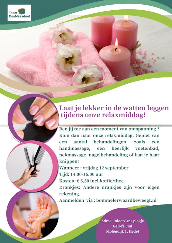 Ben jij toe aan een moment van ontspanning en verwennerij? Kom dan op vrijdag 12 september naar onze relaxmiddag. Geniet van een aantal heerlijke behandelingen en voel je helemaal relaxed!