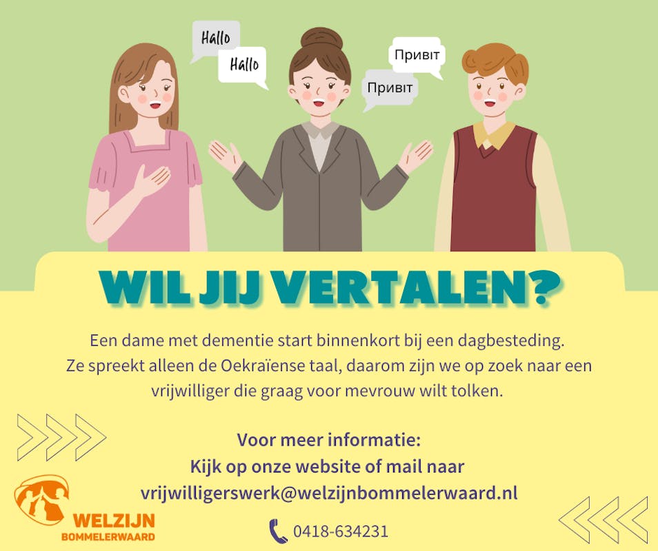 Binnenkort start een Oekraïense dame op een dagbesteding. Om goed met de begeleiding te kunnen communiceren, heeft ze een tolk nodig. Spreek jij Oekraïens of ken je iemand die wel zou willen helpen?
